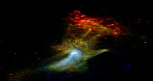 科学者達は、手が超新星(supernova)になった星の残骸で、パルサーPSR B1509-58を残し誕生させ、物質の巨大な雲が噴出したと、考えています。残った雲を、高エネルギーX線を介して見ることができ、それは緑色、赤色、青色の手のように現れ、約175光年に渡る広がりでした。NuSTAR望遠鏡の主任研究員であるフィオナ・ハリソン(Fiona Harrison)氏は、「NuSTARのユニークな視点は、最高エネルギーのX線を見ると、私達に全く新しい光の中で、十分に研究された物体や領域を示しています」と述べました。「新しい画像はパルサーの風雲を描いており、超新星で爆発した星の密集した残骸が生成したものです。」と、フィオナ氏は、付け加えました。PSR B1509-58という名前のパルサーが、このことから残されたもので、これは1秒間に約7回自転し、星の死の間に放出された物質に粒子の風を吹き込むことができます。これらの粒子が近くの磁場と相互作用すると、それらは手の形のX線の輝きを作り出します。科学者達は現在、噴出された物質が手の形をとっているかどうか、またはパルサーの粒子との相互作用がそれらをそのように見せているかどうか、よく分かりません。科学者達は、NuSTARの総ての観測から幾つかのことを集めました。手は拳のように見え、彼らには手がかりが与えられており、そして指先に現れた赤い雲はRCW89と呼ばれる構造です。しかしながら、宗教的なウェブサイトに住む一部の信者の中には、科学者達の見解に興味がありません。