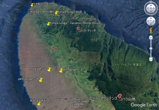 ハワイ島のコハラにある、3つの放射状の遺跡(petroglyphs)の座標